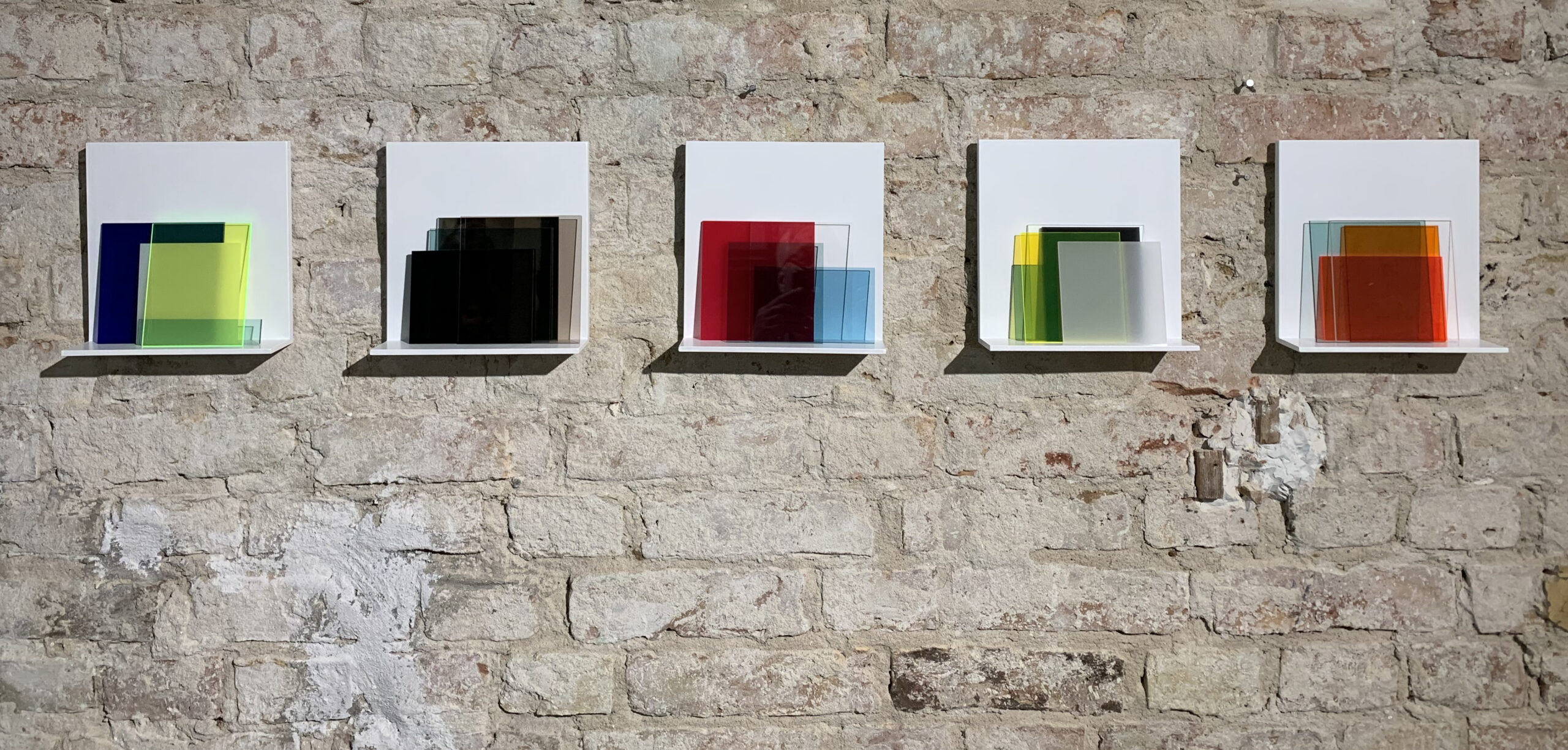 glänzende ZeitAcrylplatten auf Holzkonsole, Größe variabel auf 20 x 20 x 5 cm, Projektraum Bäckerkeller, Berlin, 2022